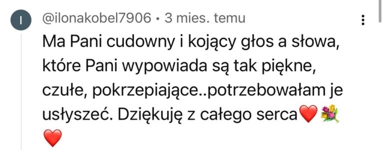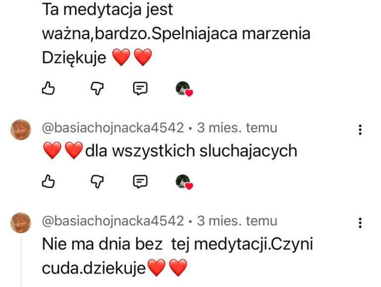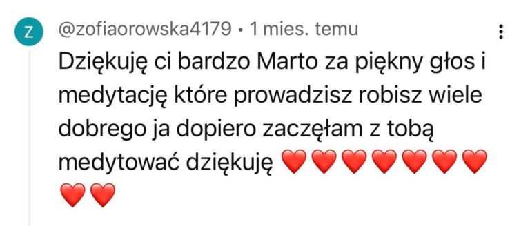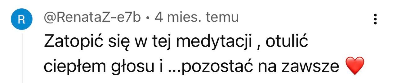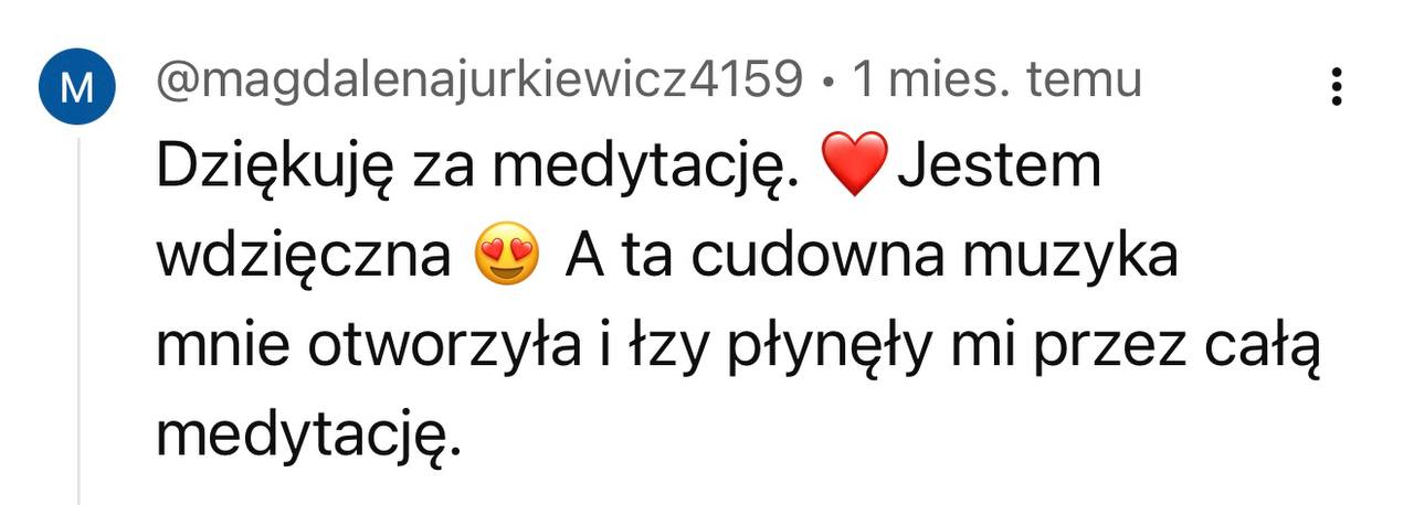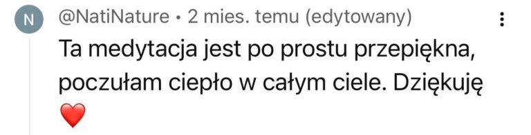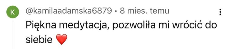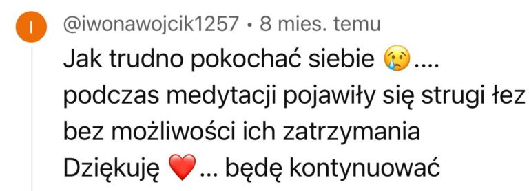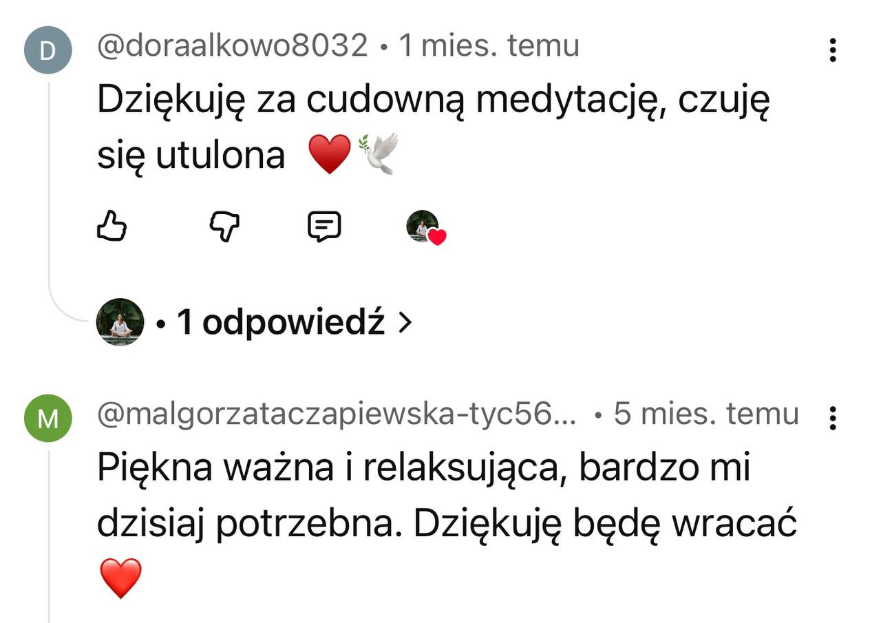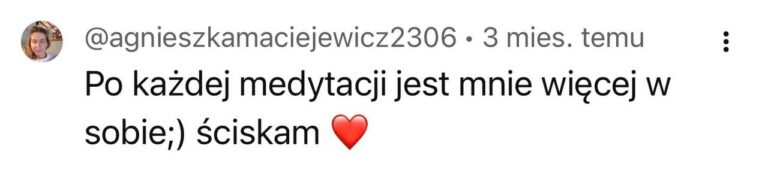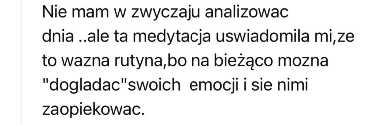 Masz zły tydzień? Nie zrobiłaś medytacji przez 5 dni? To nie jest egzamin. Najważniejsze to wróć, włącz nagranie, podążaj za głosem. Nawet jeśli w ciągu 12 tygodni zrobisz tylko połowę – twoje ciało i tak dostanie sygnał: „Jestem ważna. Wracam do siebie”. To nie ma być kolejny obowiązek – tylko przestrzeń, do której wracasz, kiedy jesteś gotowa.