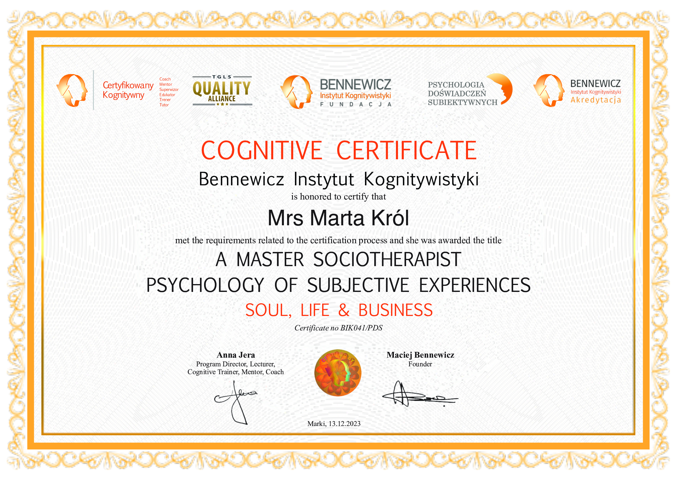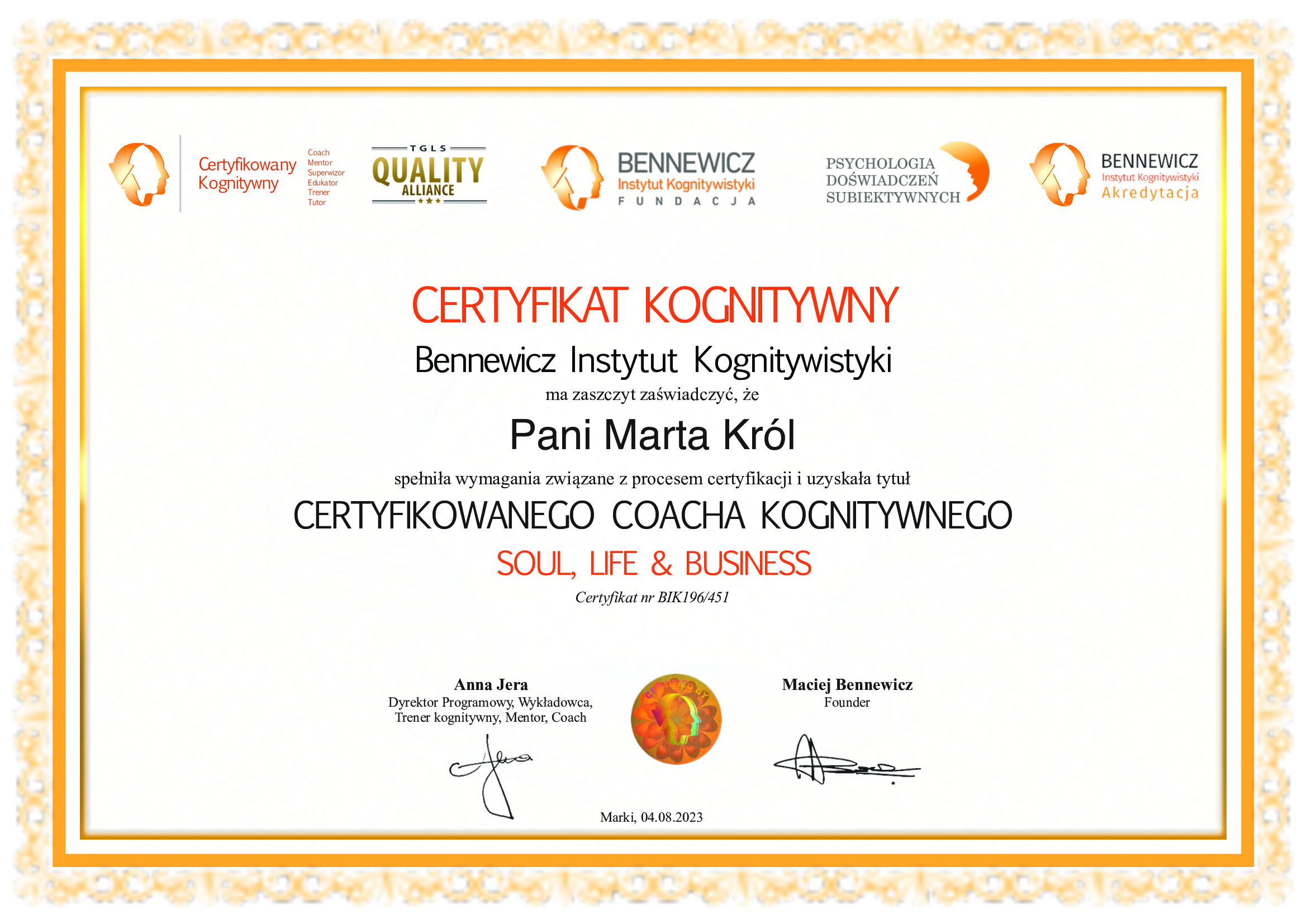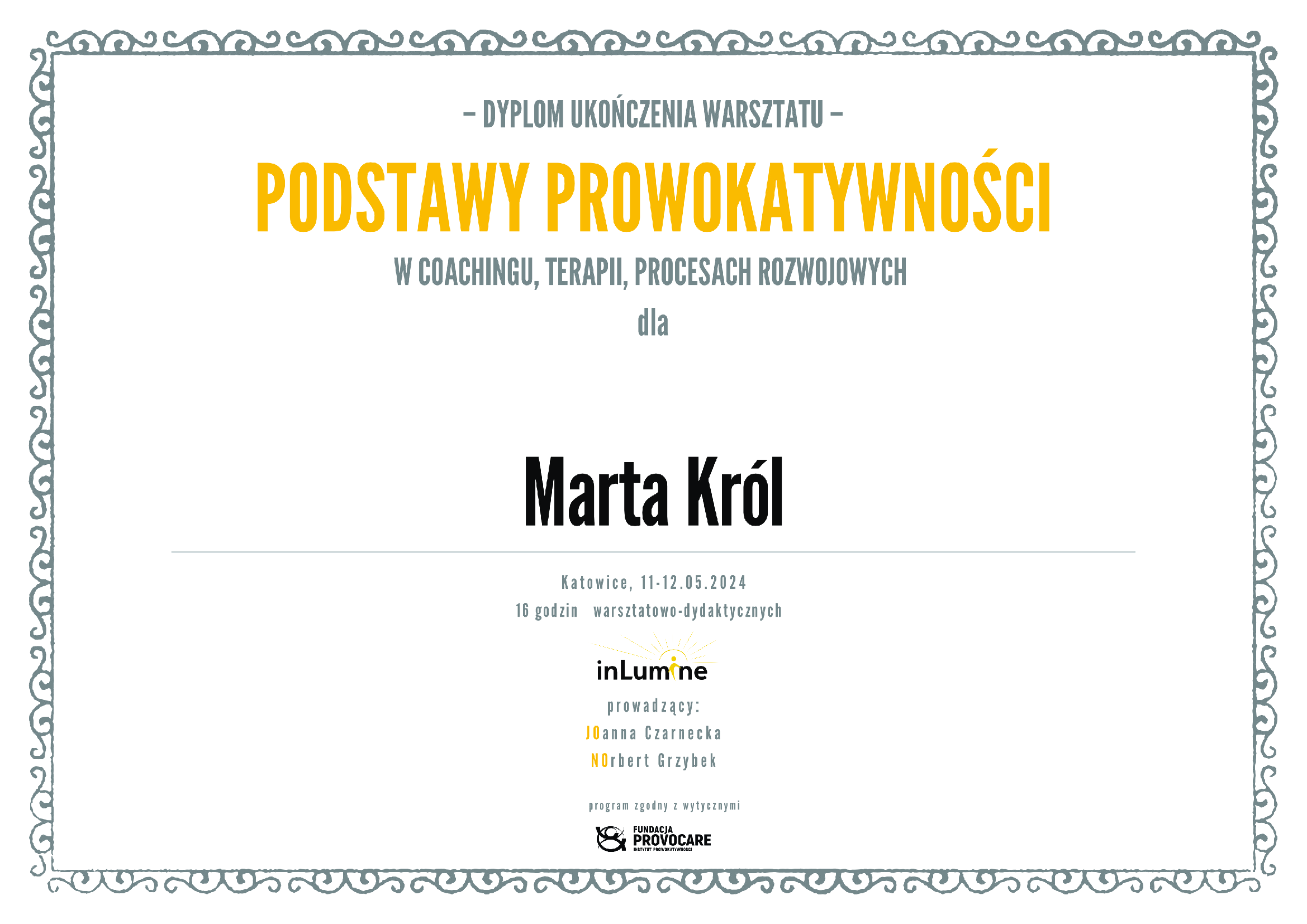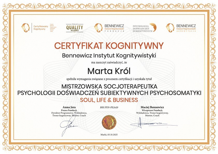 Jestem aktorką, lektorką, dziennikarką, certyfikowaną coachinią kognitywną (Bennewicz Instytut Kognitywistyki), coachini prowokatywną, socjoterapeutką (Psychologia Doświadczeń Subiektywnych), coachinią i praktykiem integracji oddechem (Szkoła CUUD), terapeutką TSR (Terapia Skoncentrowana na Rozwiązaniach). Przeszłam szkolenia z Mindfulness i Psychosomatyki (Bennewicz Instytut Kogniwistyki). Ciągle się uczę i rozwijam, by móc jak najskuteczniej pomagać i dawać wsparcie tym, którzy tego potrzebują. Prowadzę warsztaty wyjazdowe, online oraz sesje indywidualne, tworząc przestrzeń dla głębokiej transformacji.